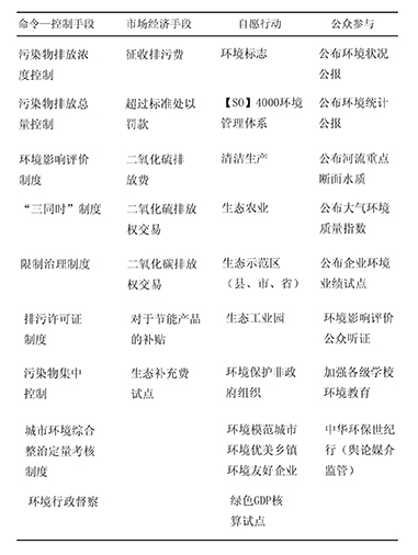 關于我國環(huán)境治理的實踐過程,張坤民等(2007) 建立了包栝命令—控制手段、經濟刺激手段和公眾參與或稱自愿手段等多樣化的環(huán)境政策工具矩陣。見表2.1