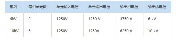 高壓電機節(jié)電系統(tǒng)根據(jù)電機額定電壓的不同,功率單元柜每相所串聯(lián)的個數(shù)也不同,6KV,10KV電壓與功率單元關系如下: