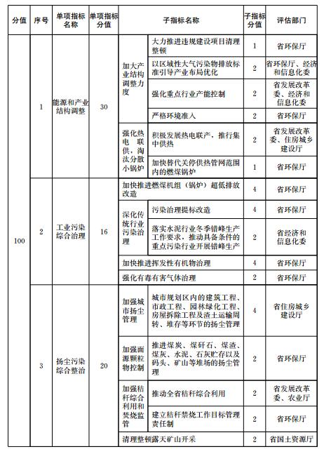 大氣污染防治重點(diǎn)任務(wù)完成情況包括能源和產(chǎn)業(yè)結(jié)構(gòu)調(diào)整、工業(yè)污染綜合治理、揚(yáng)塵污染綜合整治、機(jī)動(dòng)車船排氣污染控制、綠色生態(tài)屏障建設(shè)、大氣污染防治資金投入、大氣環(huán)境管理等7項(xiàng)指標(biāo)。大氣污染防治重點(diǎn)任務(wù)完成情況各指標(biāo)的定義、評估要求和計(jì)分方法等由有關(guān)評估部門按照《二期行動(dòng)計(jì)劃》的職責(zé)分工確定,評估部門根據(jù)子指標(biāo)分值對各市重點(diǎn)任務(wù)進(jìn)行打分,并向省環(huán)保廳提供評分結(jié)果。評估部門為兩個(gè)部門以上的,各評估部門分別打分后取平均值作為本項(xiàng)重點(diǎn)任務(wù)得分。