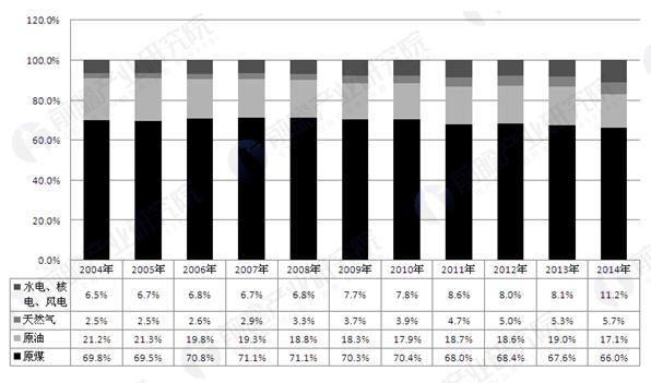 2004-2014年我國能源消費(fèi)結(jié)構(gòu)(單位:%)