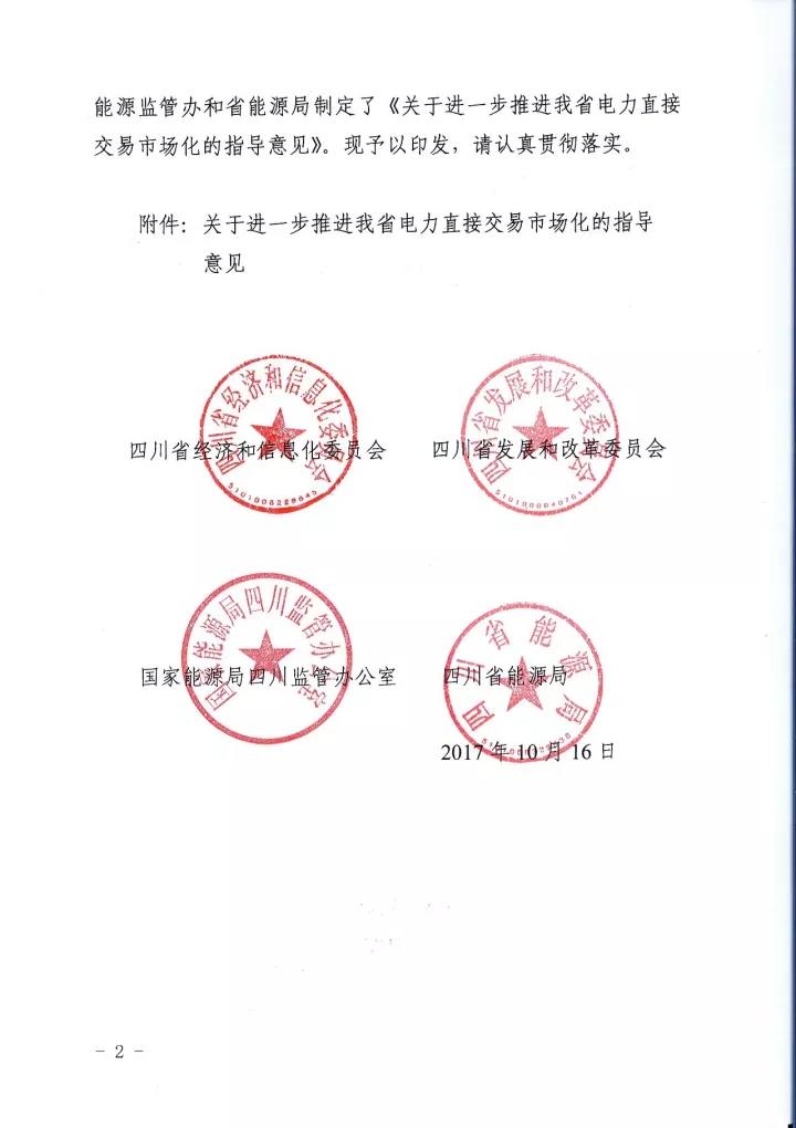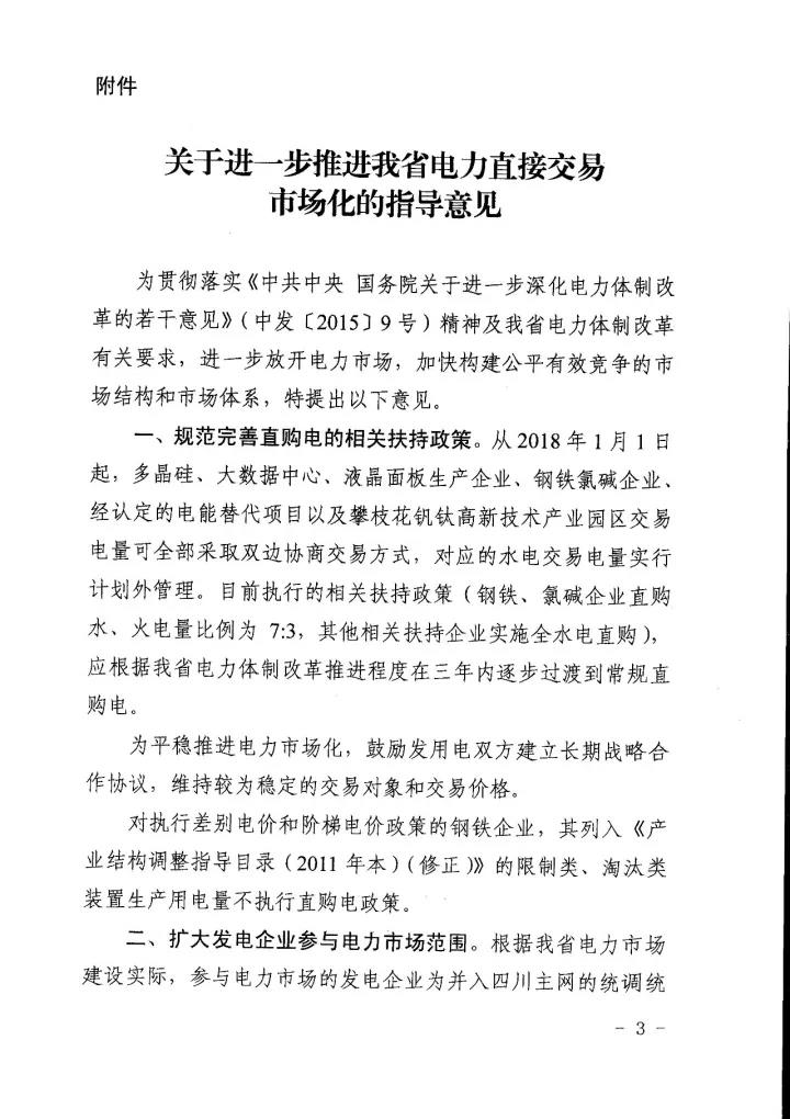 四川省經(jīng)信委、四川省發(fā) 改委、國家能源局四川監(jiān)管辦、四川省能源局日前聯(lián)合下發(fā)了《關(guān)于進(jìn)一步推進(jìn)我省電力直接交易市場化的指導(dǎo)意見》(以下簡稱“意見”)。意見中稱,將規(guī)范完善直購電的相關(guān)扶持政策,擴(kuò)大發(fā)電企業(yè)參與電力市場范圍,全面放開售電公司參與電力市場,穩(wěn)步推進(jìn)進(jìn)商業(yè)用戶進(jìn)入電力市場,積極開展產(chǎn)業(yè)園區(qū)直接交易試點,穩(wěn)妥開展跨省跨區(qū)富余可再生能源電力現(xiàn)貨交易試點,放開地方電網(wǎng)(躉售區(qū))進(jìn)入直接交易市場,有序推進(jìn)其他特殊行業(yè)企業(yè)完全電力市場化。詳情如下: