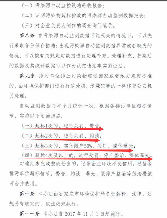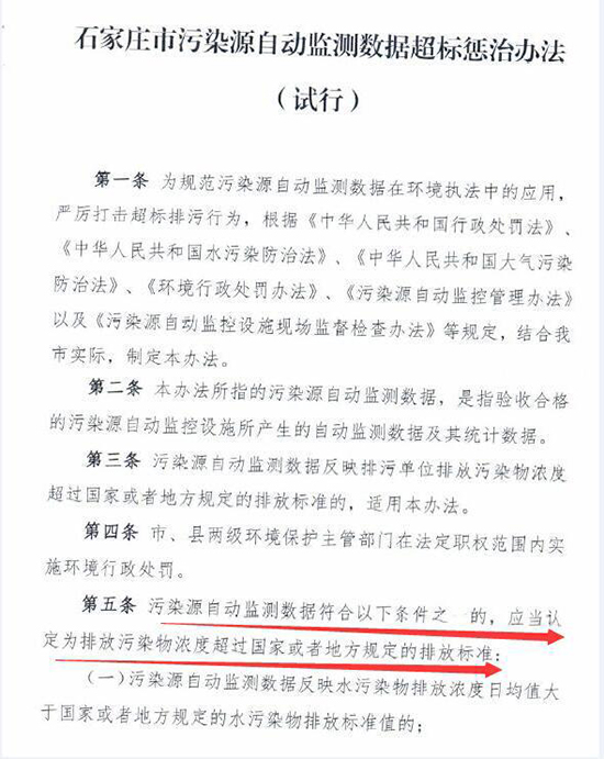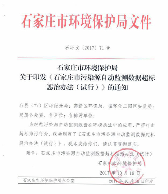 近日河北石家莊市環(huán)保局印發(fā)《石家莊市污染源自動監(jiān)測數據超標懲治辦法(試行)》(以下簡稱“辦法”)。辦法明確,企業(yè)污染源自動監(jiān)測數據出現超標將被處罰,超標4次及以上,將停產整治。辦法自11月1日起施行。