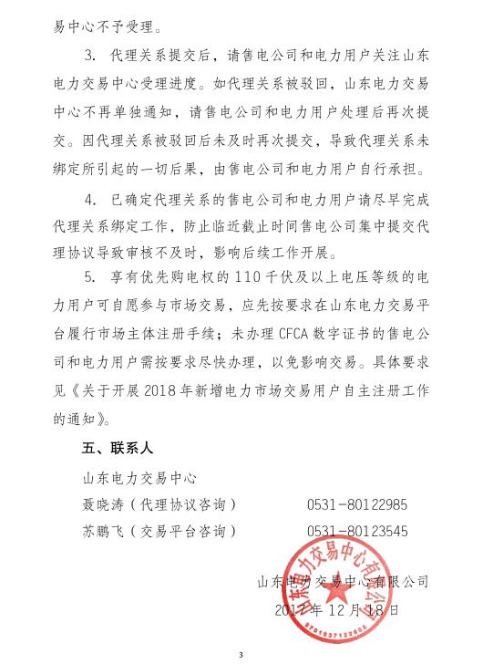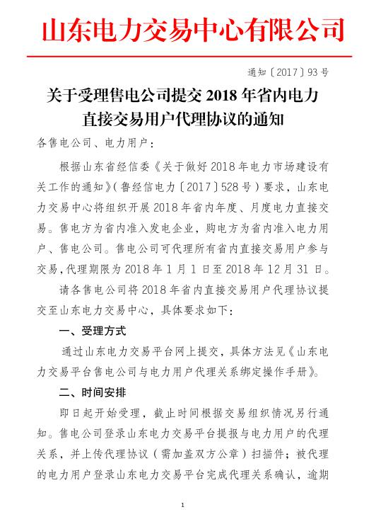 山東電力交易中心發(fā)布:關(guān)于受理售電公司提交2018年省內(nèi)電力直接交易用戶代理協(xié)議的通知
