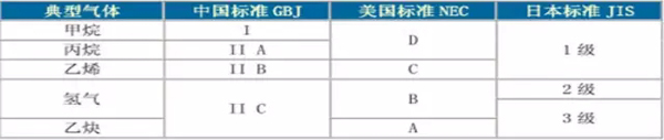 中國(guó)、美國(guó)、日本典型爆炸性氣體分組對(duì)照