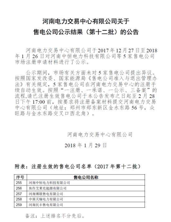 新聞中心日前,河南電力交易中心發(fā)布了關(guān)于售電公司公示結(jié)果(第十二批)的公告,公告中稱,于2017年12月27日至2018年1月26日對河南中恒電力科技有限公司等5家售電公司注冊申請材料進(jìn)行了公示,未收到異議,注冊手續(xù)自動生效。