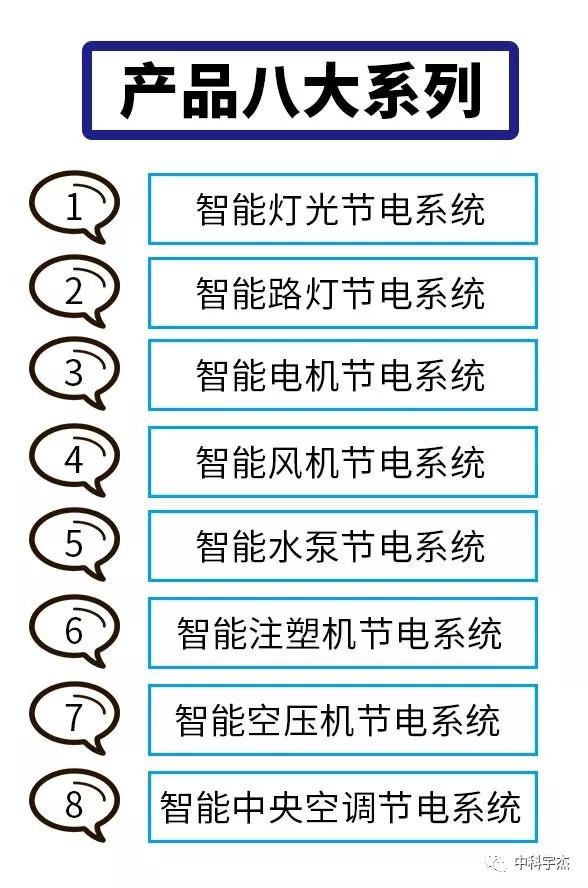 中科宇杰的產(chǎn)品以無縫式嵌入和智能化為核心,特別針對用能單位設(shè)備的特點,在完全不影 響用能單位設(shè)備正常運行和改變設(shè)備運行參數(shù)的前提下,達(dá)到節(jié)電的目的,實現(xiàn)用能設(shè)備和中科宇杰節(jié)電機的無縫銜接,經(jīng)過十多年發(fā)展,中科宇杰的產(chǎn)品已經(jīng)形成了8大體系。