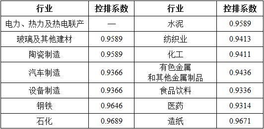 行業(yè)控排系數(shù)(具體數(shù)值見(jiàn)附件1-1)是用于核定企業(yè)既有設(shè)施排放配額的參數(shù)。依據(jù)各行業(yè)減排成本、減排潛力、行業(yè)競(jìng)爭(zhēng)力、各行業(yè)碳排放歷史變化趨勢(shì)等因素綜合測(cè)算確定。