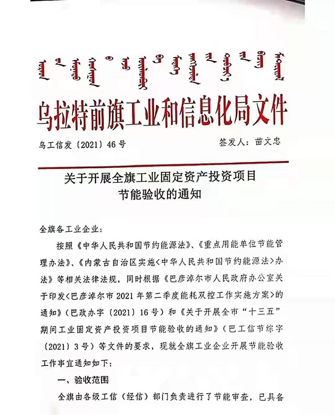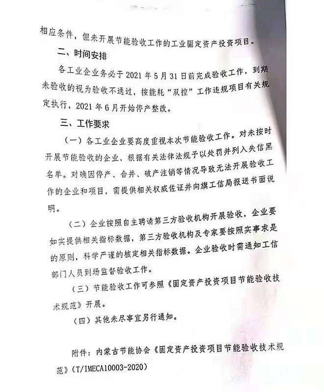 烏拉特前旗:對全旗工業(yè)企業(yè)開展節(jié)能審查驗收,對期限內驗收不通過的企業(yè),按能耗“雙控”工作違規(guī)項目有關規(guī)定執(zhí)行停產整改。