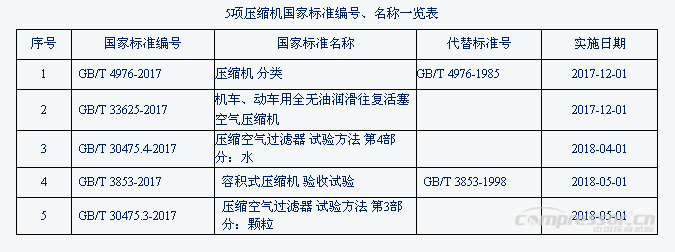 2017年第11號(hào)、第23號(hào)、第29號(hào)中華人民共和國(guó)國(guó)家標(biāo)準(zhǔn)公告,由國(guó)家質(zhì)量監(jiān)督檢驗(yàn)檢疫總局、國(guó)家標(biāo)準(zhǔn)化管理委員會(huì)批準(zhǔn)發(fā)布了共5項(xiàng)壓縮機(jī)國(guó)家標(biāo)準(zhǔn),具體內(nèi)容見(jiàn)表: